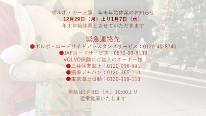 ボルボ・カー三鷹のInfomationをご覧いただきありがとうございます 本日は年内最終営業日となりました クリスマスが終わり、ショールーム内のグッズも新しくなり、新年を迎える準備が整いました 本年も格別のご厚情を賜り心より感謝申し上げま...